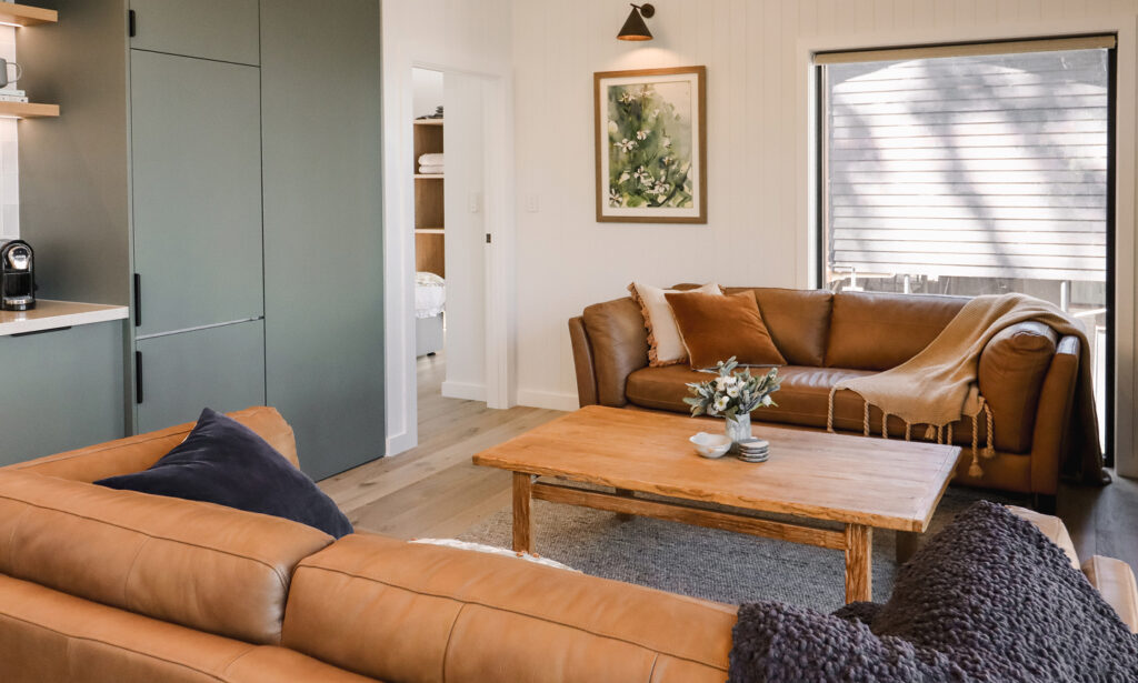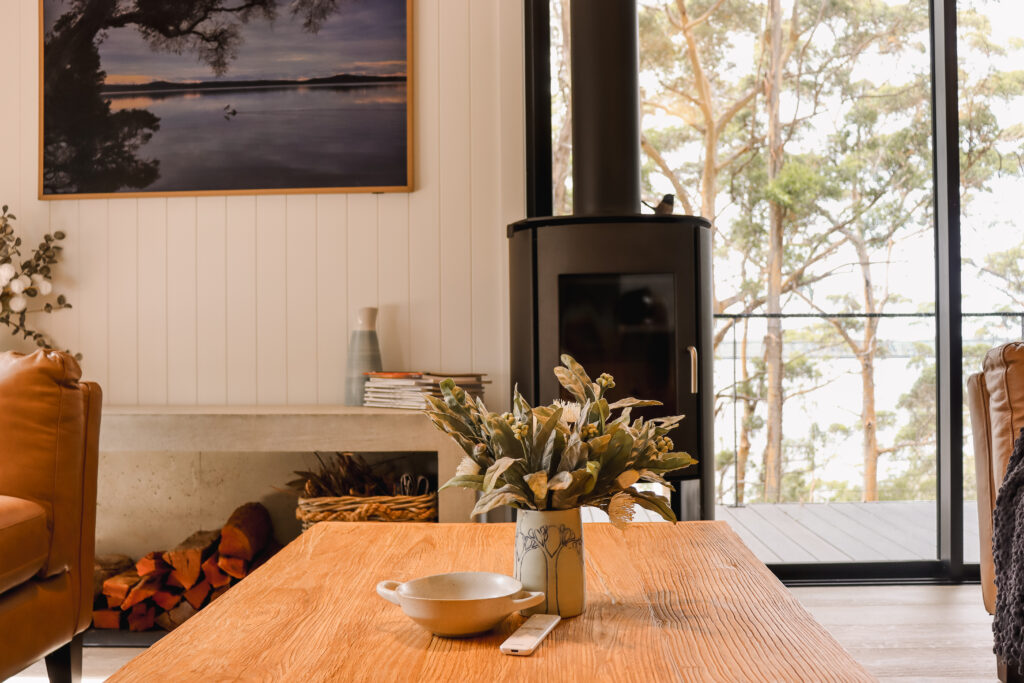 The open-plan living space is designed for ease and togetherness. Two generous leather lounges, a wood-burning heater for winter evenings, and seamless connectivity via Starlink Wi-Fi, shape a space for shared time and slow evenings.