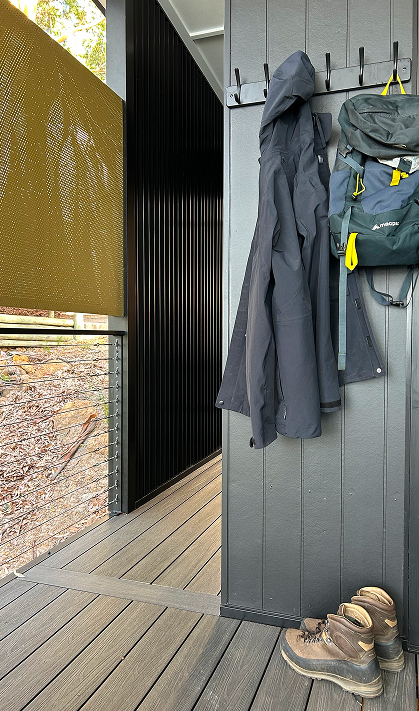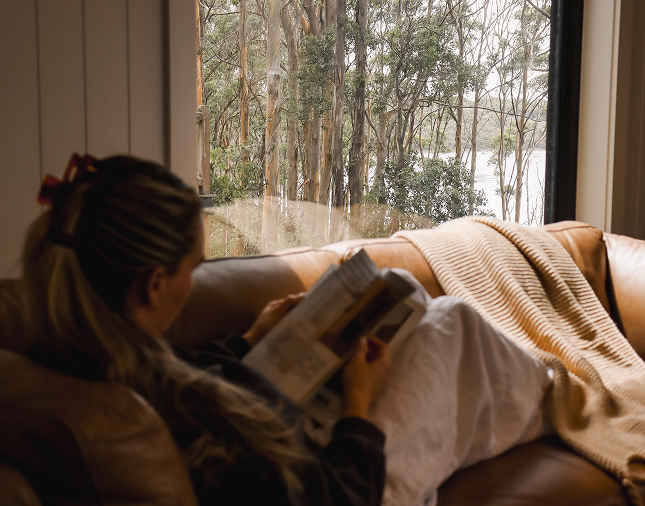 On still mornings, oversized doors slide away, opening the Cabin to the treetops. The day begins with fresh South Coast air, whether moving through yoga on the front deck or sinking into a bean bag with a book in a sunlit corner.