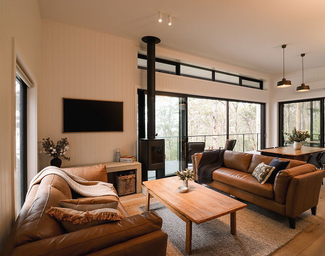 The Cabin features two generous bedrooms, each with queen-sized beds and expansive views across forest and water. Large sliding glass doors invite the Denmark breeze inside during warmer months, blurring the line between indoors and out.