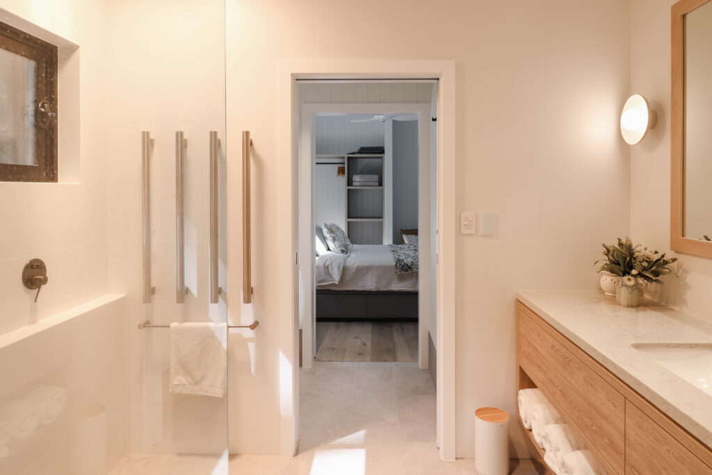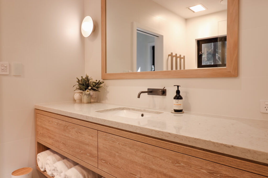 The nature-inspired bathroom offers a moment of pause at the end of each day. A rainhead shower and premium Somic body care products, made in Western Australia using natural ingredients, create a grounding, restorative experience.
